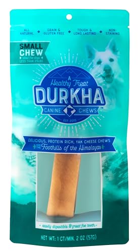 DURKHA HIMALAYAN YAK DOG CHEWS ALL-NATURAL YAK CHEESE MILK TREAT HIMALAYAN YAK STICK CHEWS FOR DOGS PUPPIES Durkha is a yak milk based ancient recipe prevalent among the people living in the Himalayas who have been enjoying it for centuries. After boiling pure yak milk, it is cooled down and all the fat is removed. The fat free milk is now boiled and mixed with lime and salt, removing the lactose and leaving just the protein making it easily digestible for dogs. Next, all the moisture is extracted, a process that takes almost 2 weeks, resulting in the hardened Durkha being cut into different shapes and sizes. Lastly, it is smoked for four months to give it the flavor dogs love. When the chew gets too small, simply microwave the leftover piece for 45 seconds, let it cool down for 2 minutes, and give the yummy Durkha puff to your dog. Durkha yak milk chew sticks are a healthy source of protein and packed with healthy nutrients! These Himalayan dental treats will keep your dog chewing for hours. Durkha's delicious Himalayan Chews for puppies and dogs are naturally gluten free and grain free - a perfect yak chew treat thats gentle on sensitive stomachs. Durkhas Himalayan chews are made using traditional techniques in the Himalayan Mountains and just 3 simple ingredients: yak milk, salt, lime juice. Plus, Durkha yak cheese milk dental chew is a hard dog treat that encourages active chewing, which reduces tartar and improves oral hygiene. Also works great as a puppy teething treat! Please note, this is a natural product. Color may vary.