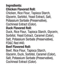 Details: Good ‘n’ Tasty® chews offer a tasty variety of flavors that dogs love. These delicious chews are bursting with flavor to deliver truly delightful, long-lasting treats your dog will love. These flavor-packed Good ‘n’ Tasty Soft & Crunchy Rolls are made with real chicken, duck or beef, so they’re sure to get your dog’s tail wagging. With a soft outside and a crunchy inside, these rolls are bursting with flavor, and the exciting variety of textures will keep dogs satisfied. With three exciting flavors – premium chicken, wholesome duck and tasty beef – these snacks offer a good source of protein for a tasty treat your dog will love. Good ‘n’ Tasty Soft & Crunchy Rolls bring the fun and the flavor – making them a scrumptious way to satisfy your dog’s natural urge to chew. This variety pack contains chicken flavored rolls, duck flavored rolls and beef flavored rolls. Feed your dog one Good ‘n’ Tasty Soft & Crunchy Roll per day. Intended for intermittent or supplemental feeding only. For supervised consumption only. Select a chew slightly larger than your pet’s mouth. Discard chunks or fragments. Always provide plenty of fresh drinking water and visit your veterinarian regularly.
