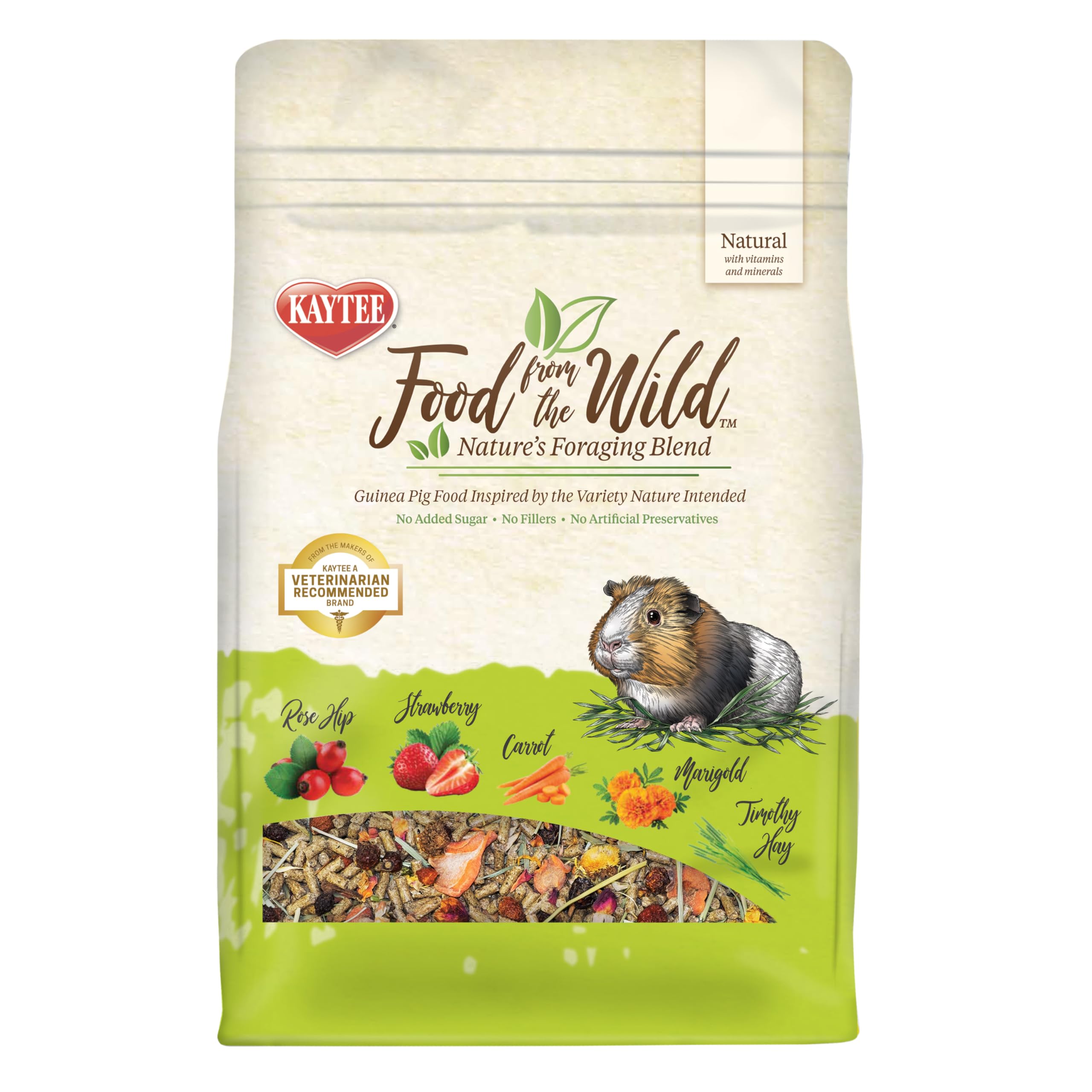 Inspired by the ancestral feeding habits of guinea pigs, Food From the Wild blend is crafted with hand-selected timothy hay, rose hip, carrot, marigold, and strawberry to encourage the healthy foraging activity your guinea pig needs. Pelleted pieces offer comprehensive nutrition and contain natural probiotics to support digestive health. Food From the Wild blend contains nutritious and tasty ingredients to meet the unique dietary needs of your guinea pig and has no added sugar, fillers, or artificial preservatives. With more than 150 years of nutritional excellence, Kaytee is honored to be at the heart of your healthy, happy feeding routine.