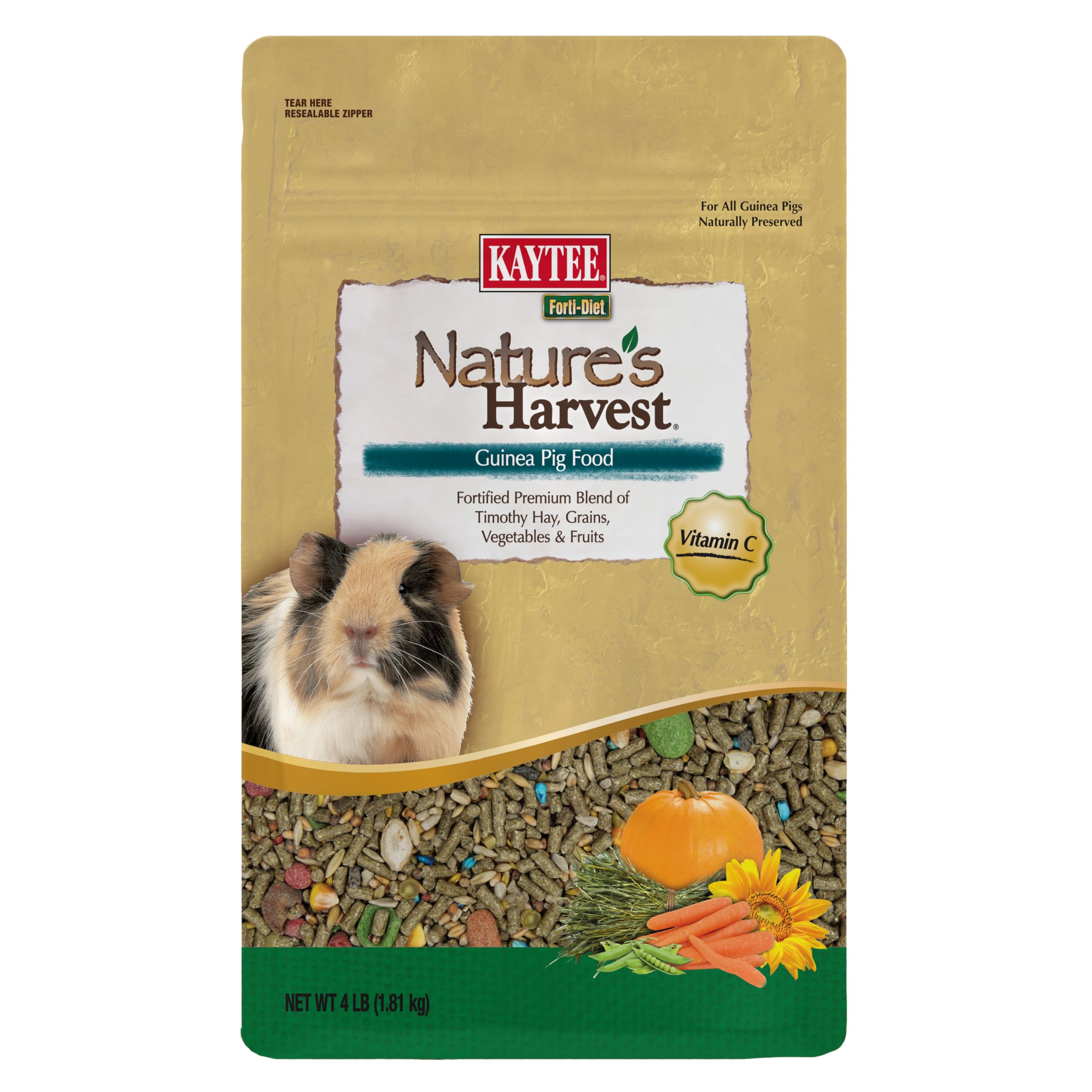 Details: Kaytee Forti-Diet Nature’s Harvest Guinea Pig Food was developed to provide your small animal with a nutritious diet and a variety of ingredients for added interest during feeding. The nutritionally fortified mix features a delicious variety of Timothy Hay, Grains, Vegetables and Fruits. Kaytee Forti-Diet Nature’s Harvest array of ingredients provides Guinea Pigs added interest during feeding to support natural foraging habits. The various shapes and textures help support dental health through natural chewing activity. Plus, the daily diet includes long lasting stabilized Vitamin C to support the dietary needs of Guinea Pigs. Each bag features a resealable zipper closure to help keep your pet's food fresh. Kaytee shows our love by ensuring we provide your pet with the best nutrition for a long and healthy life. With over 150 years of nutritional experience, it's no wonder why Kaytee is at the heart of every healthy feeding routine.