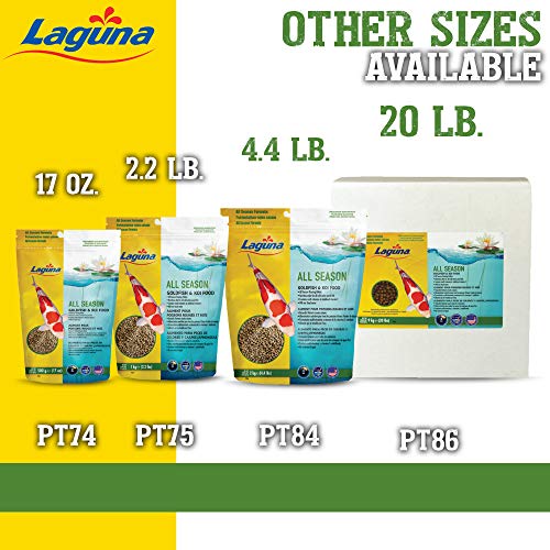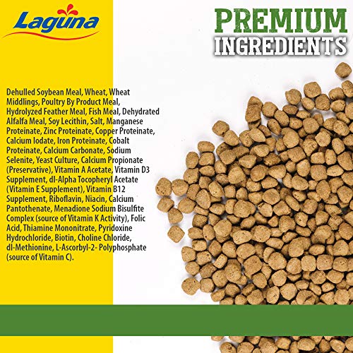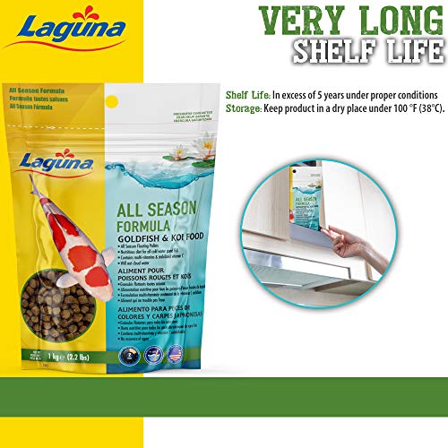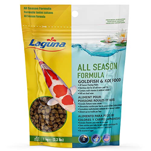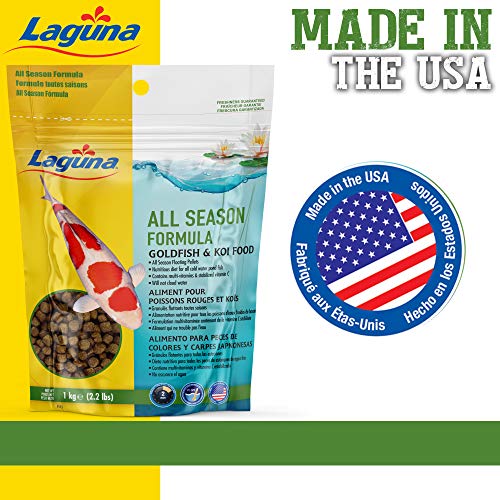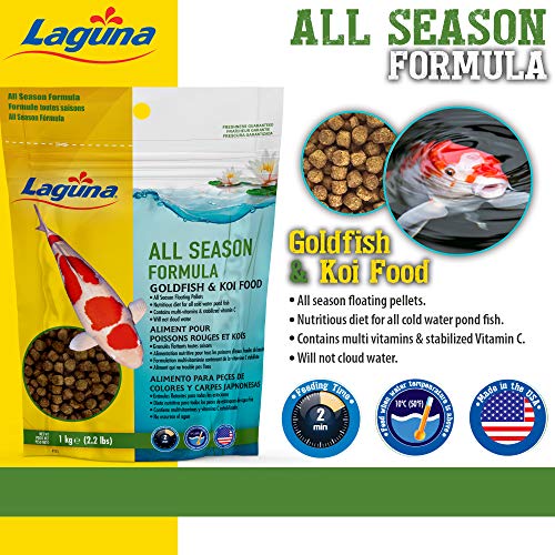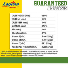 Details: Laguna All Season floating fish food contains a balanced nutritional formula for Goldfish, Koi and cold water pond fish. This blend of vitamins, minerals and amino acids are perfect for everyday feeding during the warmer months of the year. Our All Season formula contains a minimum of 32% protein to provide your pond fish with the protein rich diet needed for the warm summer months. Your fish should be fed three to four times daily as much as they will consume between 1 and 3 minutes.