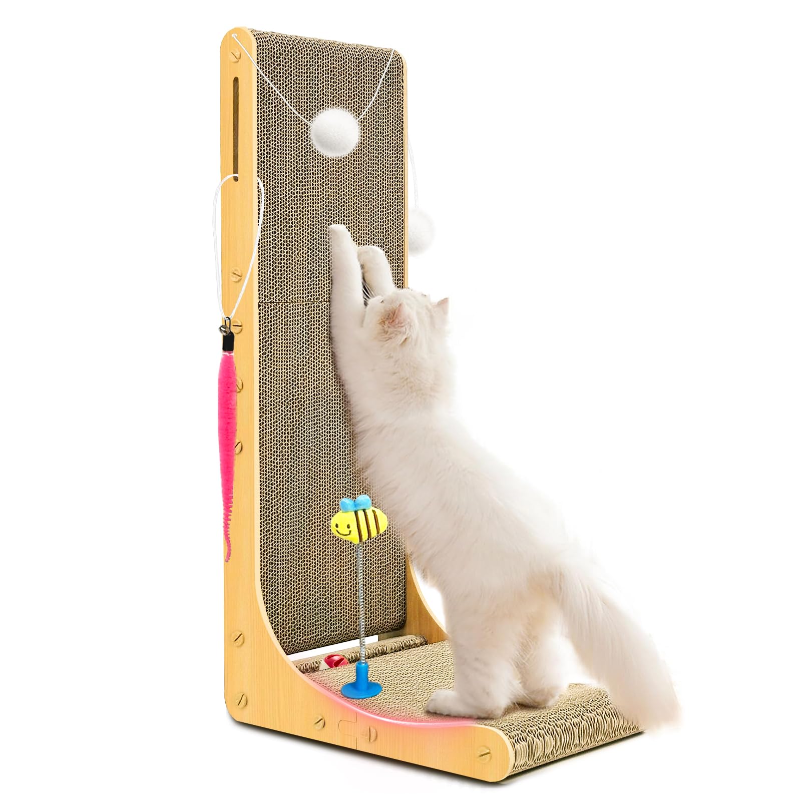 - 🐱【Attractive Toys to Guide Cats】: The cat scratching board is equipped with 1 bell ball, 3 fur balls, 1 small doll and catnip, creating an attractive "scratching station" for cats. The bell ball on the bottom track, the springy fur balls and the catnip can stimulate the nature of cats to chase and play. The fur balls on both sides and the top can attract cats to play while sharpening their claws and stretching their bodies. All toys are fixed on the cat scratching board, which is very safe.