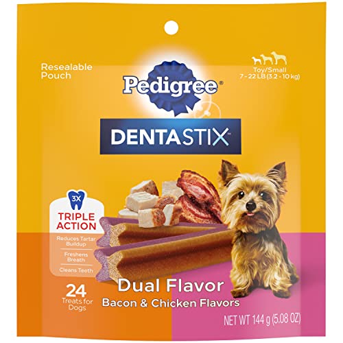 Details: Every dog loves variety, just like you and me! That's why we created DENTASTIX Dual Flavor Treats for Dogs, with both bacon and real chicken flavors, because two flavors are always better than one! Formulated for small breed dogs, their chewy texture and unique X-shape design is clinically proven to reduce plaque and tartar buildup, so treat time promotes canine oral health and oral hygiene and better dental care too! Give your dog all the same teeth-cleaning action of DENTASTIX treats with a dual flavor punch!