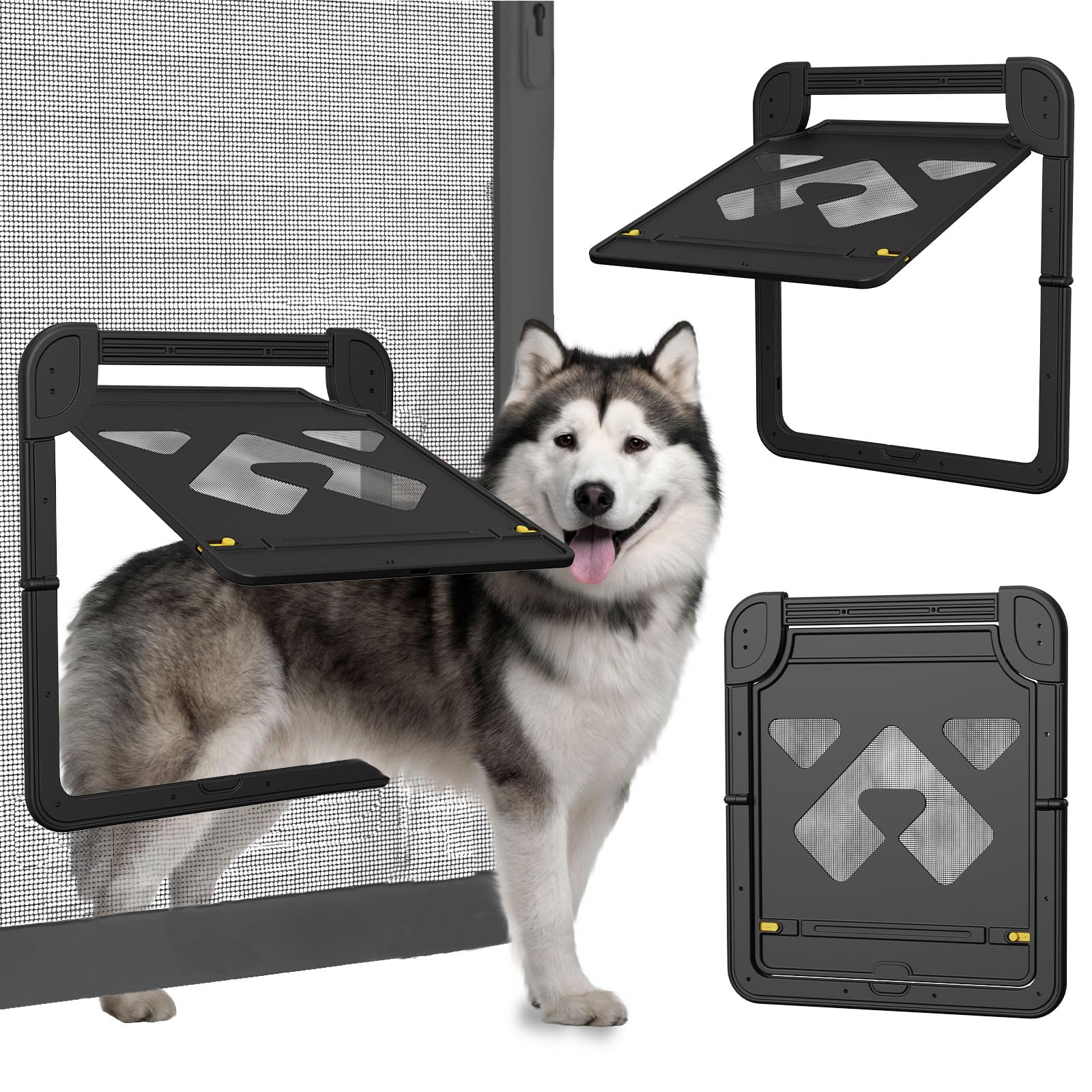 Details: This sturdy dog door from PETDIPOT is perfect for allowing large dogs access to the backyard through a sliding glass door. Made of durable plastic, the door measures 12x14 inches and has a black finish that blends discreetly into most door frames. An adjustable magnetic flap keeps flies and bugs out of the house while letting Fido come and go as he pleases. The inner panel is mounted securely inside the sliding door track using the included hardware, so it won't interfere with normal door operation. PETDIPOT dog doors help give man's best friend the freedom and independence they need while keeping them safe inside when you're not home. The large size makes it suitable for most medium to large breed dogs.