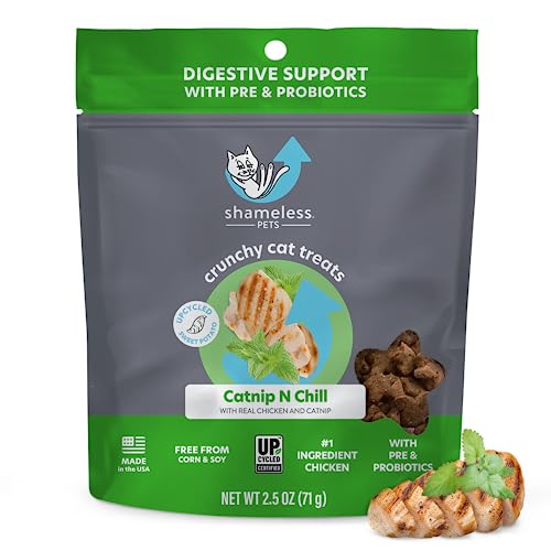 - Cat Treats That Support Digestive Health: Chillin has never been easier or tastier! Our fresh Shameless Pets Crunchy Cat Treats (Catnip N Chill) may cause a little fun followed by a trip to the couch. These crunchy, star-shaped, bite-sized treats are made with chicken, sweet potatoes, catnip and packed with both pre & probiotics, which help support digestion! Includes one 2.5 oz bag.