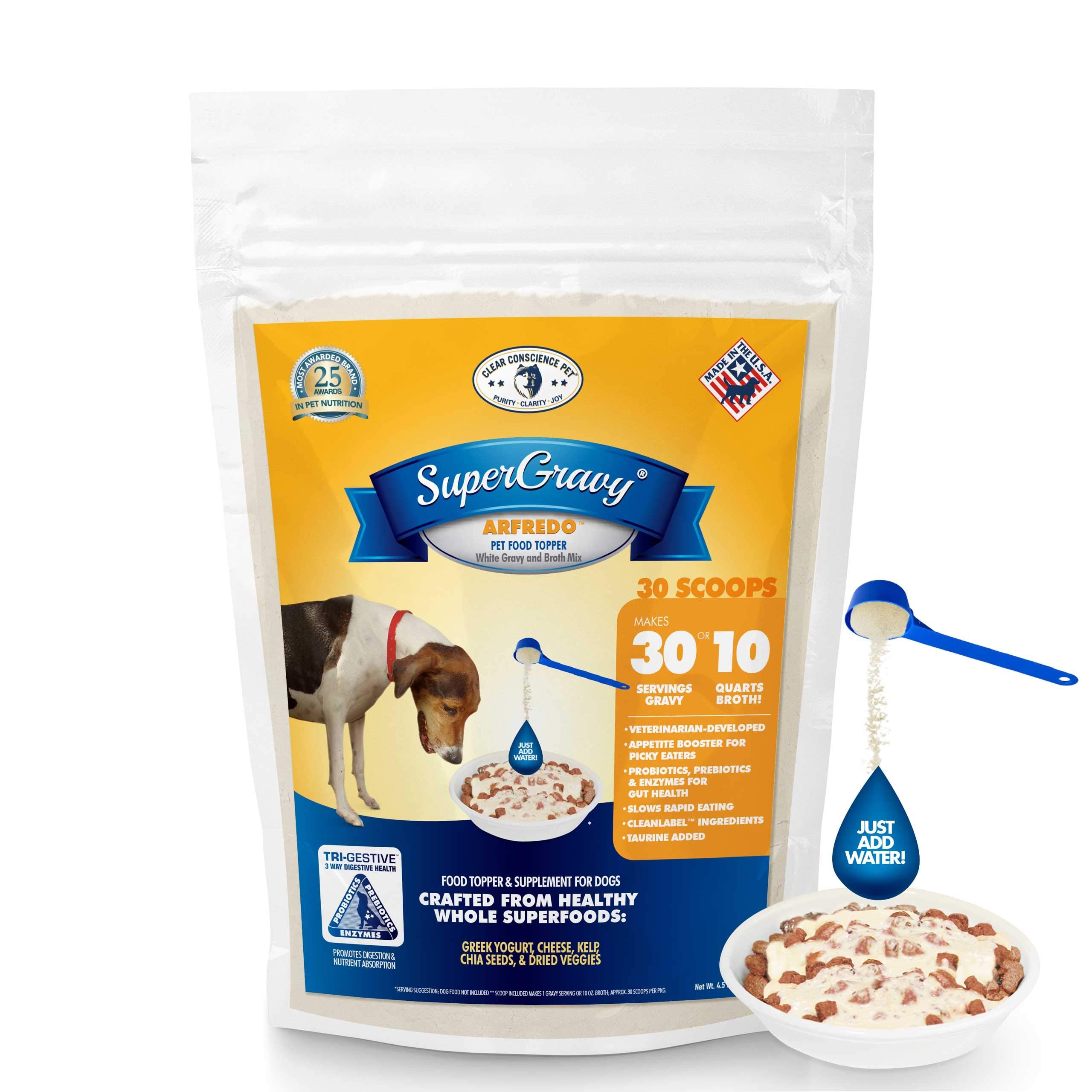 Details: Clear Conscience Pet’s SuperGravy Dog Gravy Arfredo™ creamy white with Greek yogurt & 3 Italian style cheeses: Arfredo is the only meat-free SuperGravy. Greek yogurt and real cheese provide digestible and delicious protein. Arfredo is a popular choice for dogs with allergies to one or more meat proteins because it will not conflict with Limited Ingredient Diets yet still provides 3 Way Gut Health and Great Taste. Arfredo™ is the creamiest SuperGravy thanks to Greek Yogurt and 3 Italian-style cheeses. Dogs who dig cheese are head over heels in love with Arfredo™. Ingredients: Greek yogurt powder, dried provolone cheese, chia seed, dried parmesan cheese, dried romano cheese, kelp, dried sweet potato, dried pumpkin, organic inulin from Jerusalem artichoke (source of prebiotic fiber), sunflower lecithin, dried Lactobacillus Acidophilus fermentation product, dried Lactobacillus rhamnosus fermentation product, dried Lactobacillus reuteri fermentation product, dried Bifidobacterium adolescentis fermentation product, dried Bifidobacterium bifidum fermentation product, dried Bifidobacterium logum fermentation product, dried fermentation extract of Aspergillus oryzae, (source of Protease and Amylase enzymes), dried fermentation extract of Aspergillus niger (source of Lactase enzyme), Candida rugosa (source of Lipase enzyme), Taurine. Guaranteed Analysis: Crude Protein (min.): 21%; Crude Fat (min.): 10% Crude Fiber (max.): 4% Moisture (max.): 7%; Fructooligosaccharide (FOS) prebiotic fiber*:16 mg./gr; 64 mg. per 4 gram serving scoop Taurine (min.): .50%; TOTAL MICROORGANISMS*: 125 Billion CFU/kg; 500 Million CFU per 1.5 tsp./4 gram serving scoopLactobacillus acidophilus, Lactobacillus rhamnosus, Lactobacillus reuteri, Bifidobacterium adolescentis, Bifidobacterium bifidum, Bifidobacterium logum; Calorie Content (calculated): Metabolizable Energy 4,166 kcal/kg 16 kcal per scoop provided (1 scoop = 1.5 tsp./4 gr); *Not recognized as an essential nutrient by the AAFCO Dog Food Nutrient Profile.
