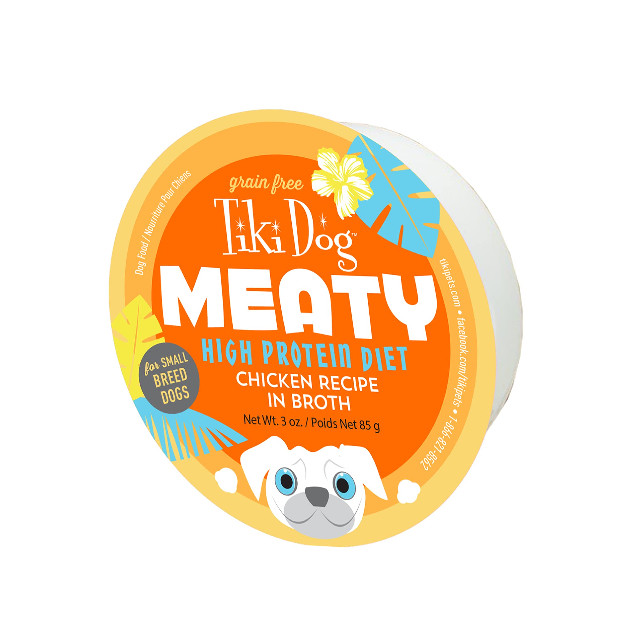 Details: Tiki Dog Meaty Recipes in Broth canned dog food focuses on protein. You won’t find any grain or added carbohydrates in these shredded meat cups. This grain free wet dog food contains shredded meat recipes that are packed in a natural broth for additional moisture and flavor. Feed your best friend delicious chicken.