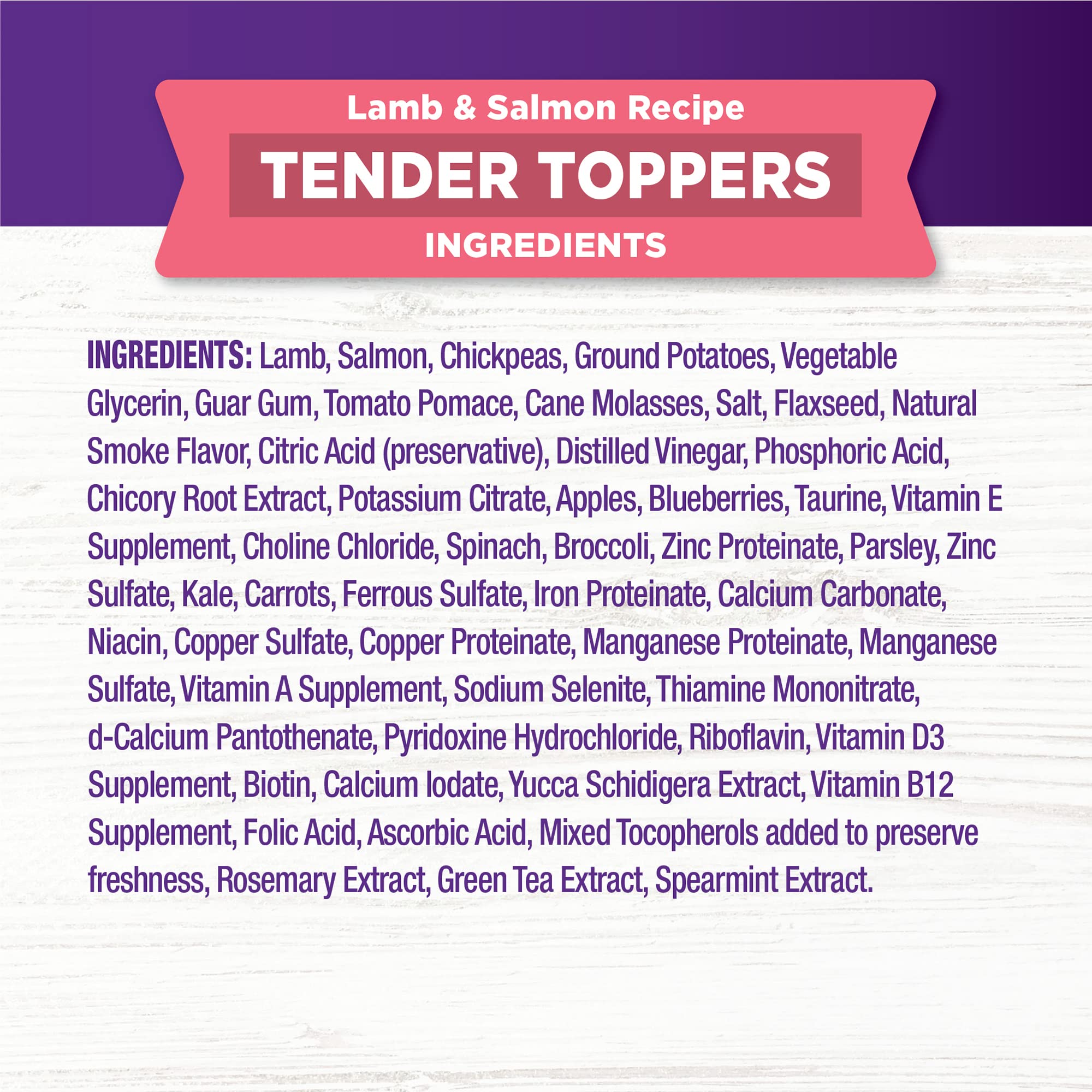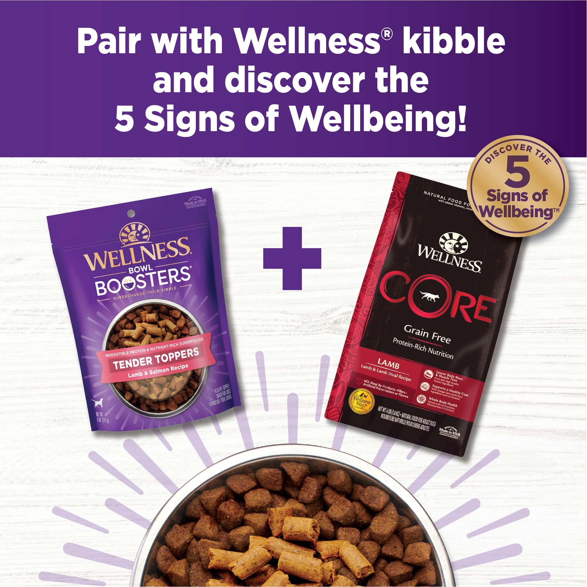 Details: Supercharge your dog's kibble with a boost of flavor with Wellness Bowl Boosters Tender Toppers Lamb & Salmon recipe. Packed with valuble nutrients and superfoods to deliver results you can see, supporting whole-body health and a healthy skin & coat for a lifetime of wellbeing. It's an easy way to add a boost of flavor and protein to your dog's meal - just sprinkle on top or mix right in! Crafted using only premium, all natural ingredients - the tender texture is great for puppies, adults and aging dogs. Plus no added grain, corn, soy, wheat-gluten, artificial colors or flavors. Mix & Match all of our recipes to make every mealtime special.